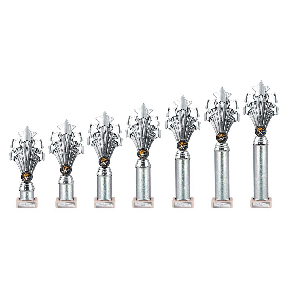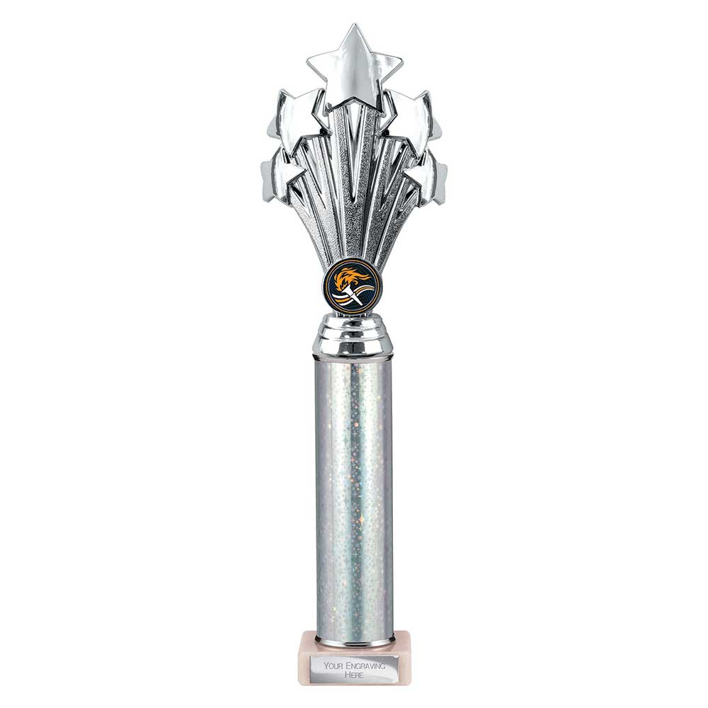 Featuring a five-star design in a silver finish, the trophy is mounted on a silver-effect tube column and finished with a square base. A circular centre holder allows for a sport or activity insert, while the base is fitted with an engraving plate suitable for names, dates, or award titles.