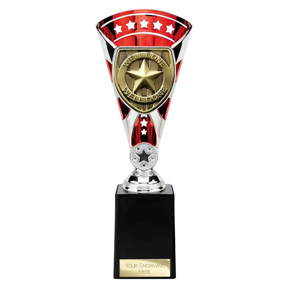 Celebrate success with the Cobra Star Trophy Cup Well Done Red and Silver.