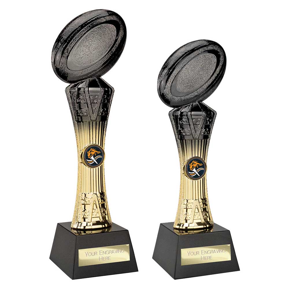 The Extreme Rugby Trophy is a bold and modern award designed to make a strong impression at any rugby presentation. Standing at either 260mm or 290mm, this eye-catching trophy features a striking rugby ball design combined with a sleek black and gold finish, making it ideal for recognising outstanding performances.