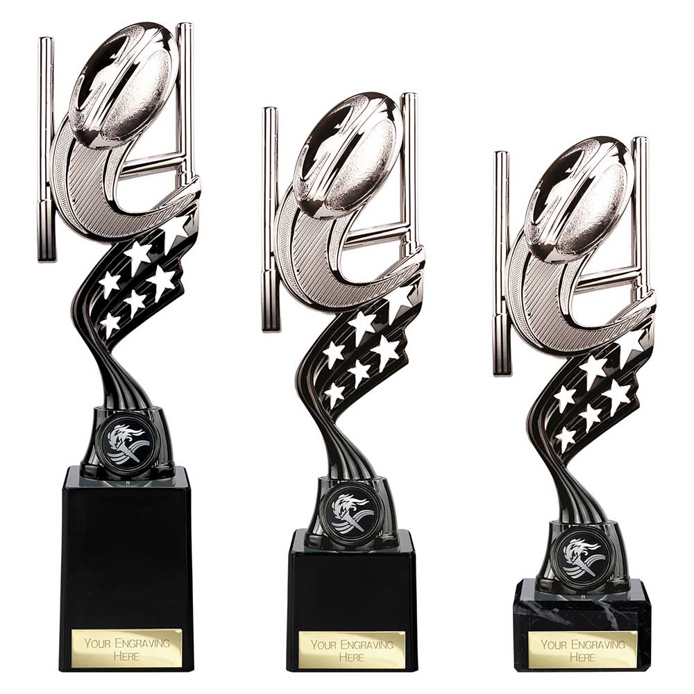 The design features a dynamic silver rugby ball and posts, set against a flowing black body with star detailing for added visual impact. A circular centre holder allows the trophy to be finished with a rugby insert, while the black base is fitted with a silver engraving plate for personalised text.
