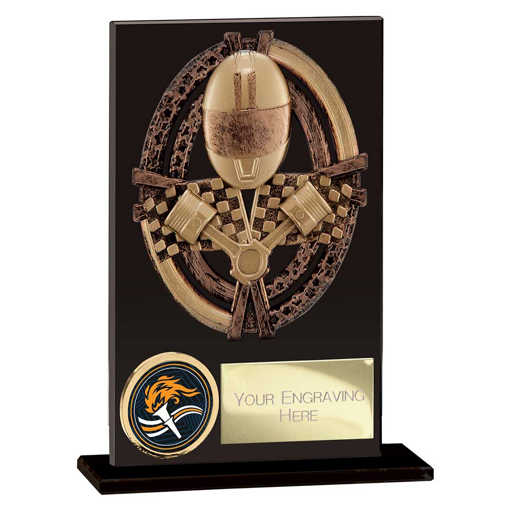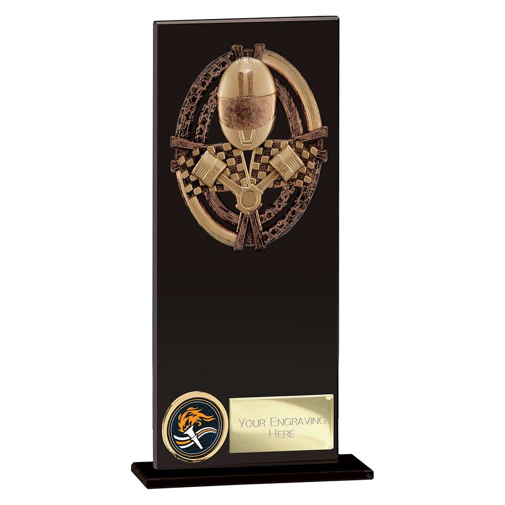 Featuring a striking black glass panel with a detailed motorsport themed design, this award offers a contemporary alternative to traditional trophies. Mounted on a matching black glass base, it includes a gold engraving plate on the front, providing space for personalised text to mark the achievement.